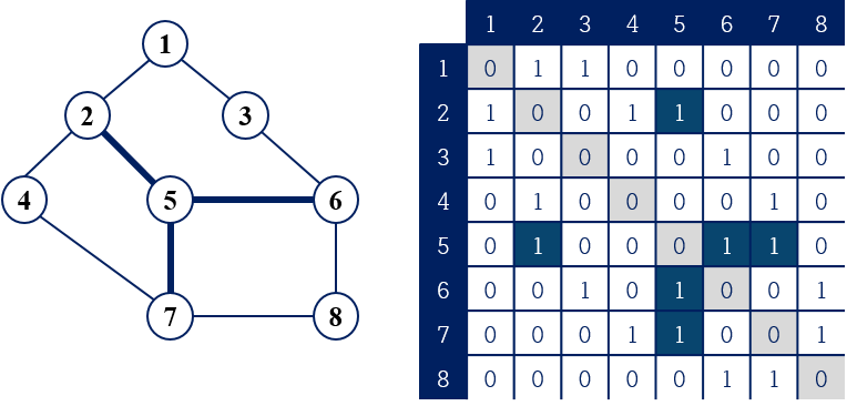 - 정점의 개수가 V개, 간선의 개수가 E개인 그래프에 대해서 V*V 이차원 배열 A에 그래프 정보 저장