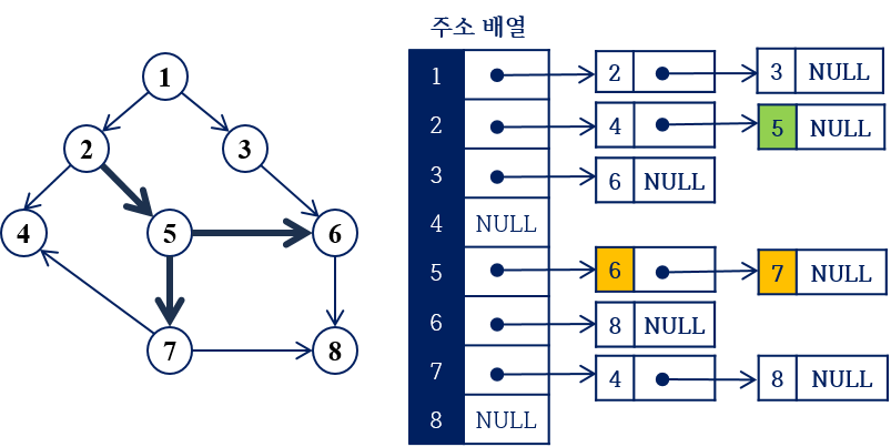 - 정점의 개수가 V개, 간선의 개수가 E개인 그래프에 대해서 V개의 연결 리스트로 그래프 정보를 저장