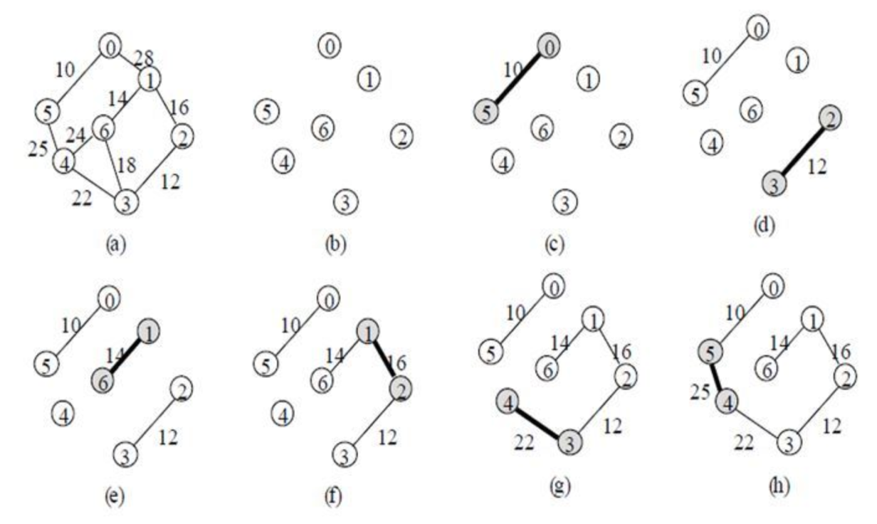 - 위에서 선택한 간선이 연결하려는 2개의 노드가 서로 연결되지 않은 상태라면, 2개의 노드를 서로 연결한다.