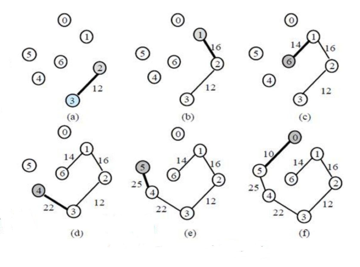 - 선택한 간선의 정점으로부터 가장 낮은 가중치를 갖는 정점을 선택