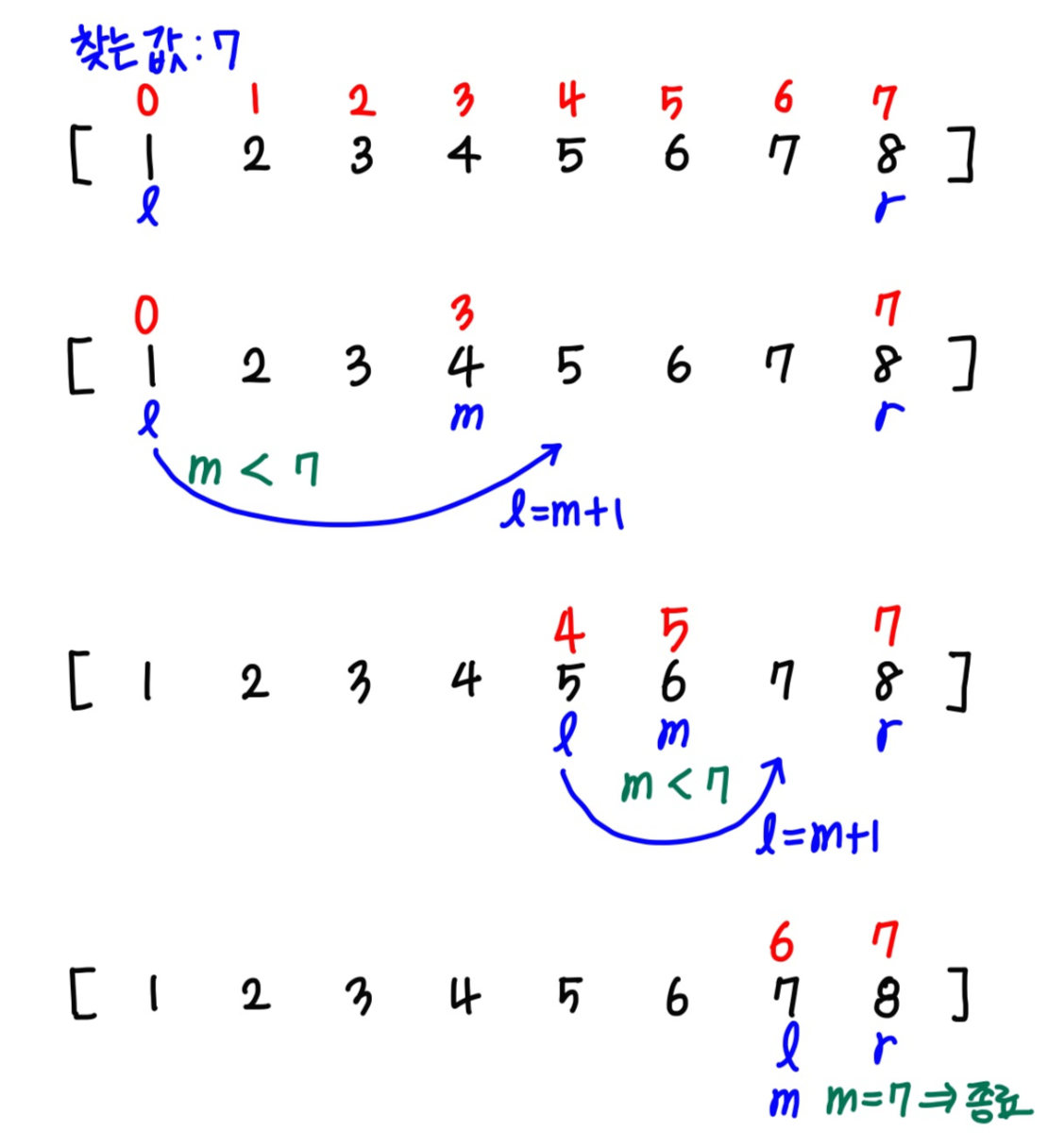 오름차순으로 정렬된 리스트에서 특정 값의 위치를 찾는 알고리즘으로, 모든 값을 순회해야하는 일반적인 search보다 더 빠르다. 중앙값을 찾는 값에 비교해서 중앙값이 찾는 값보다 크면 왼쪽을 탐색하고 찾는 값보다 작으면 오른쪽을 탐색한다.