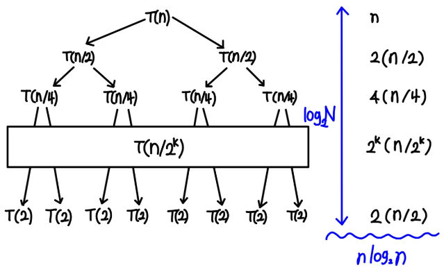 크기가 N인 배열을 반으로 쪼개면서 분할해 나가기 때문에 시간복잡도는 O(NlogN)이다.