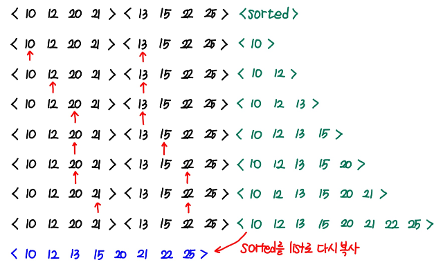 - 결합 : 정렬된 부분 배열들을 하나의 배열에 합병한다.