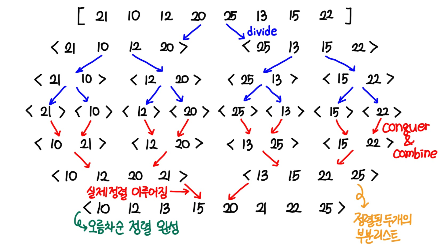 하나의 리스트를 두 개의 균등한 크기로 분할하고 분할된 부분 리스트를 정렬한 다음, 두 개의 정렬된 부분 리스트를 합하여 전체가 정렬된 리스트가 되게 하는 방법이다.